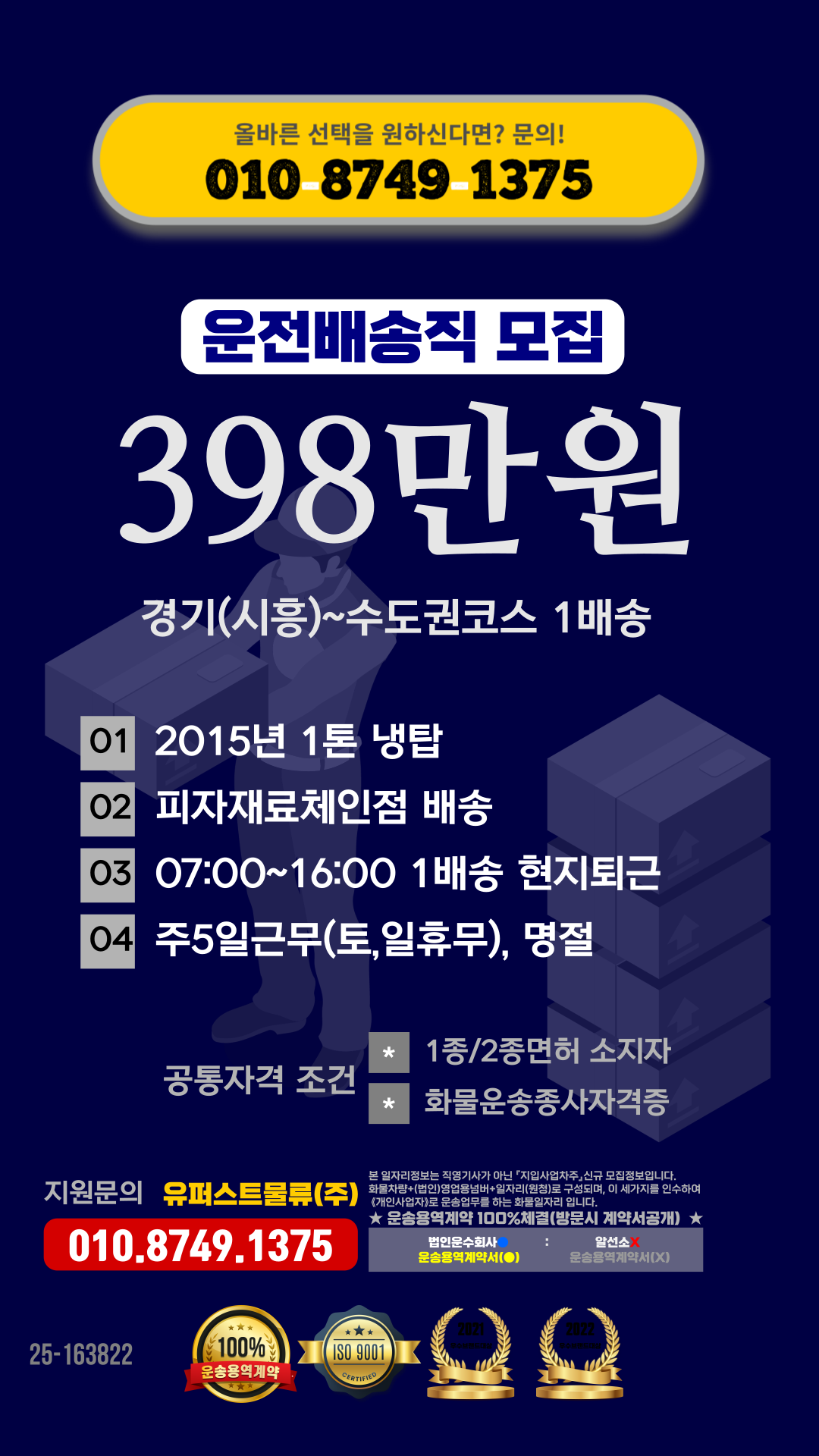 1톤정보 ★피자재료체인점 (07:00~16:00 현지퇴근 / 투잡가능 / 오토차량가능 / 증차분) 주5일근무 (당사차량)