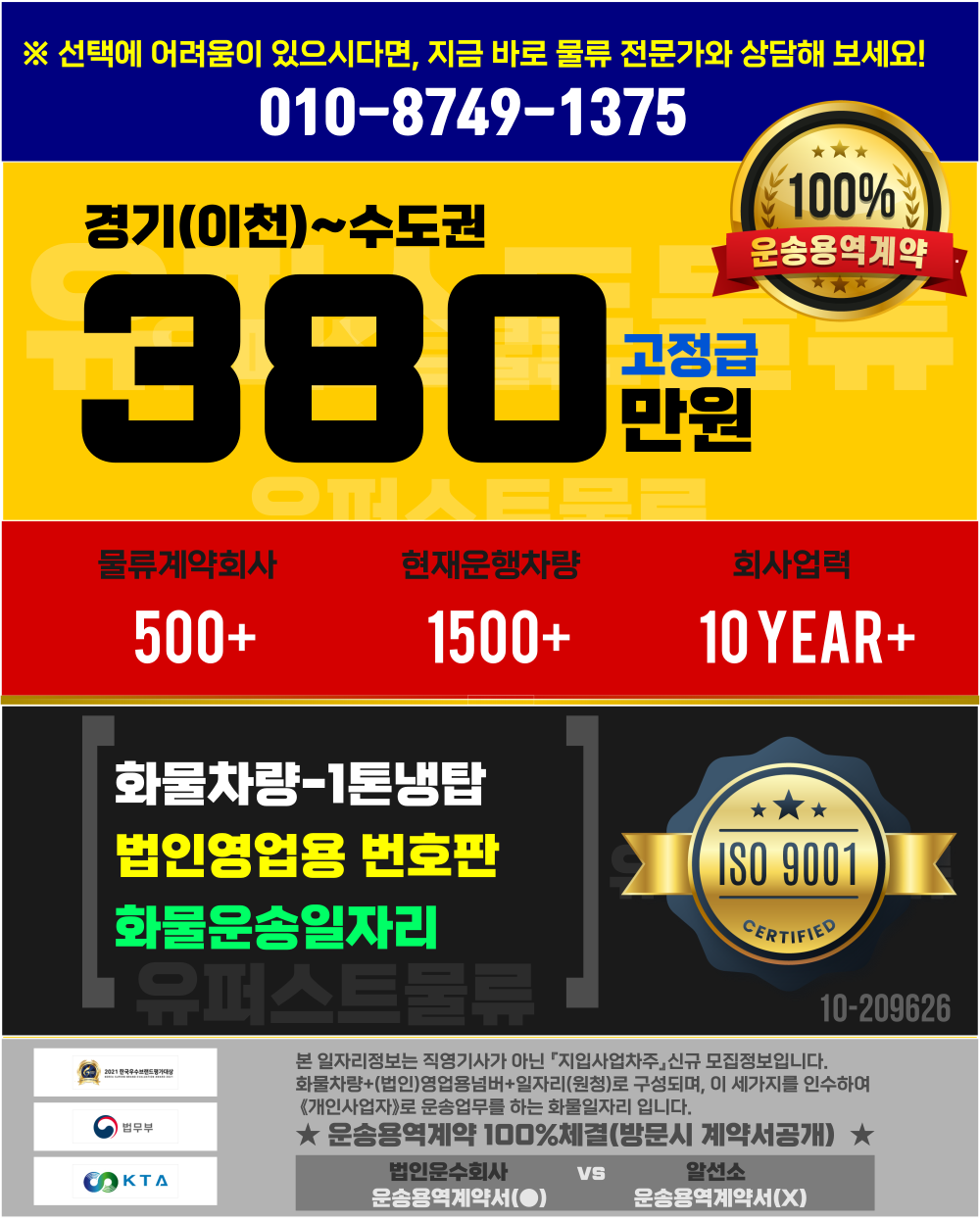 1톤정보 ★치킨프랜차이즈 (24:00~07:00 현지퇴근 / 투잡가능 / 오토차량가능 / 증차분) 주5일근무 (당사차량)