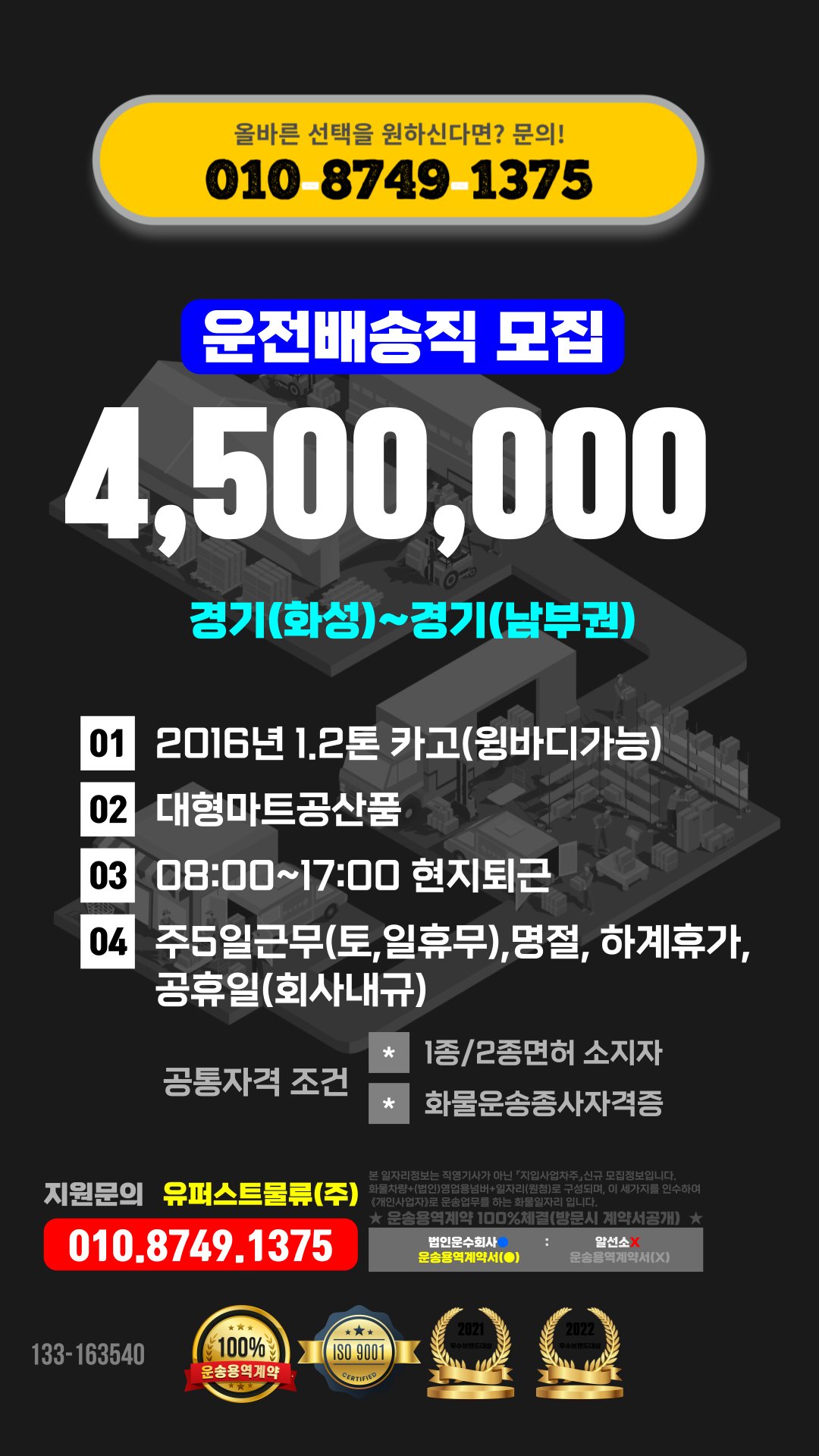 1톤정보 ★대형마트공산품 (08:00~17:00 현지퇴근 / 최고급여 / 카고 혹은 윙바디가능/증차분) 주5일근무 (당사차량)