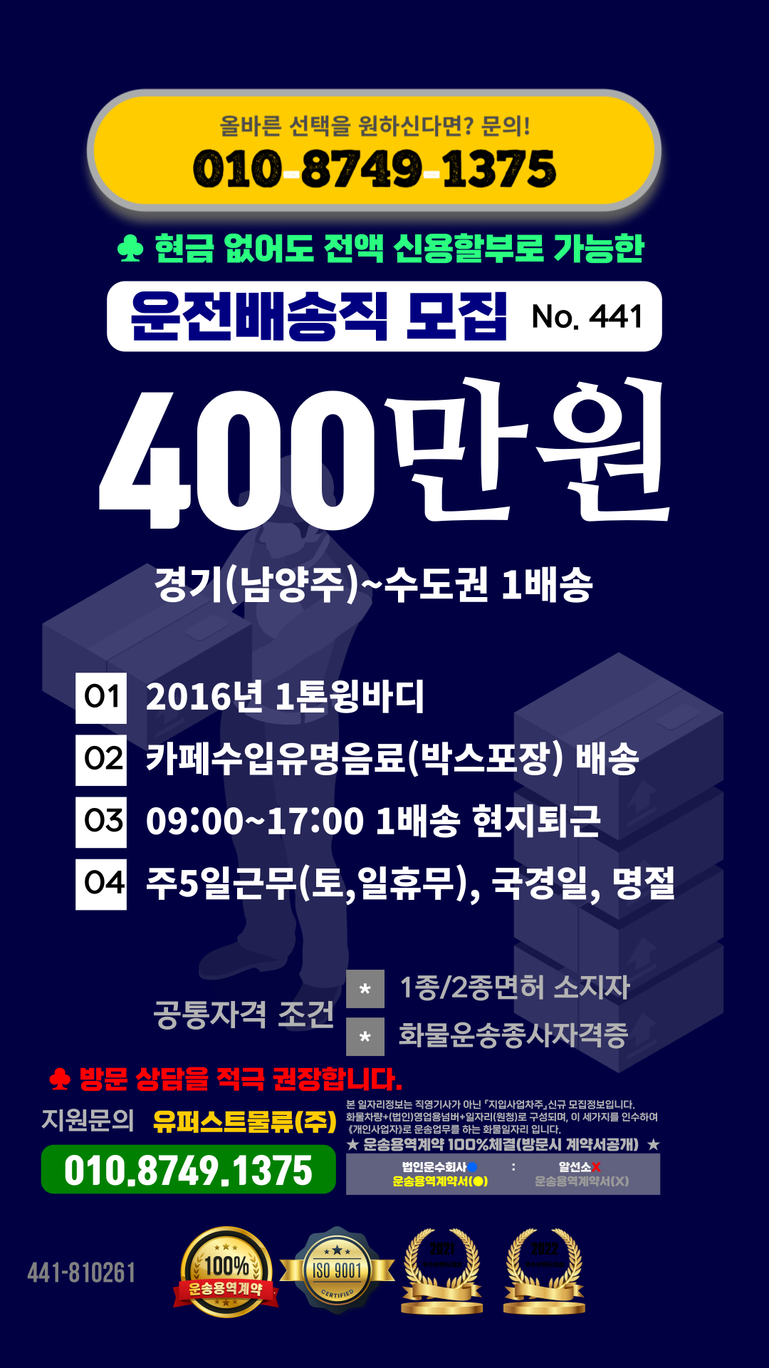 * 한번 물건 싣고 수도권거래처 20곳 내외로 배송하고 현지에서 퇴근하시면 됩니다.