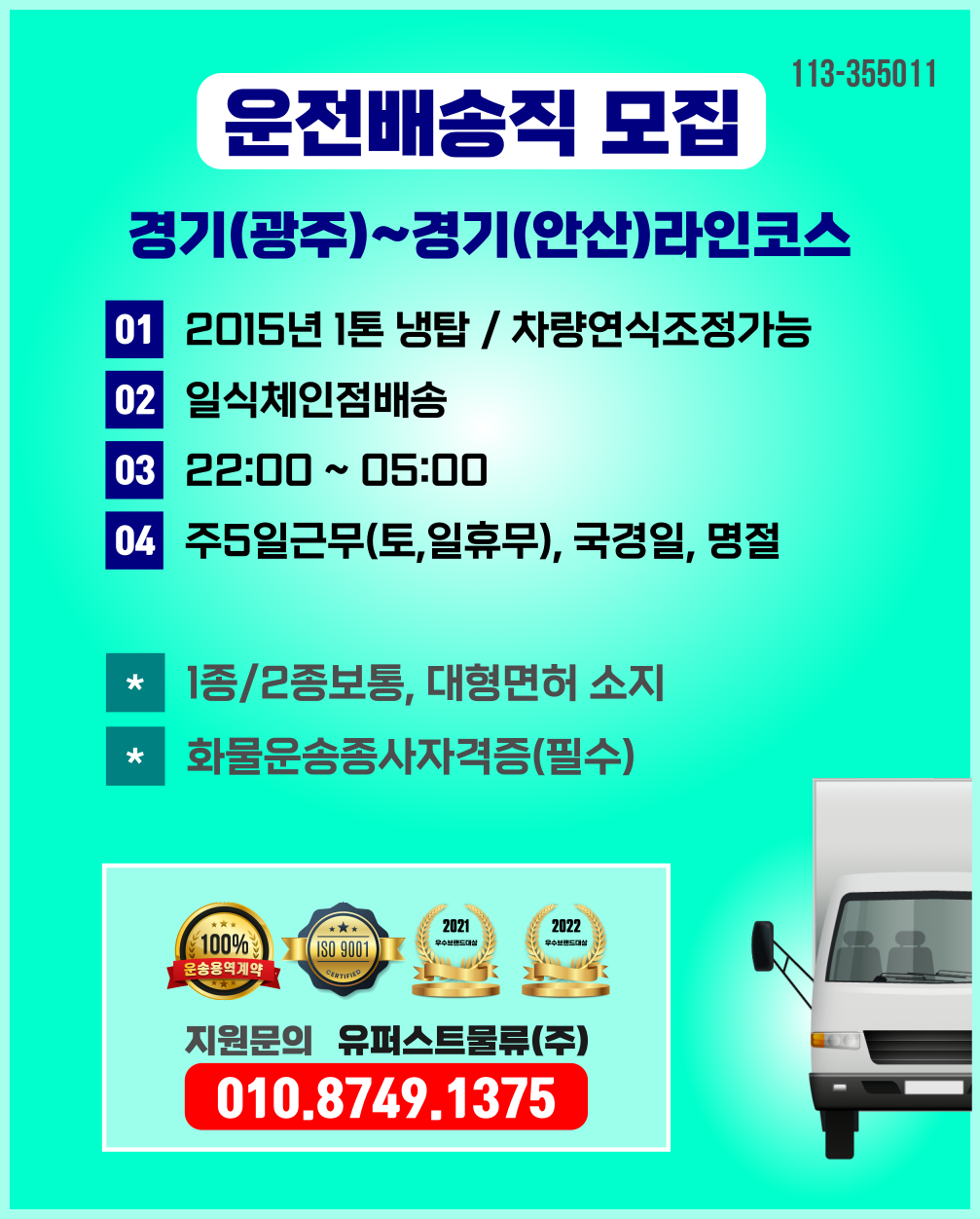 1톤정보 ★일식프랜차이즈 (22:00~05:00 현지퇴근 / 투잡가능 / 오토차량가능 / 증차분) 주5일근무 (당사차량)