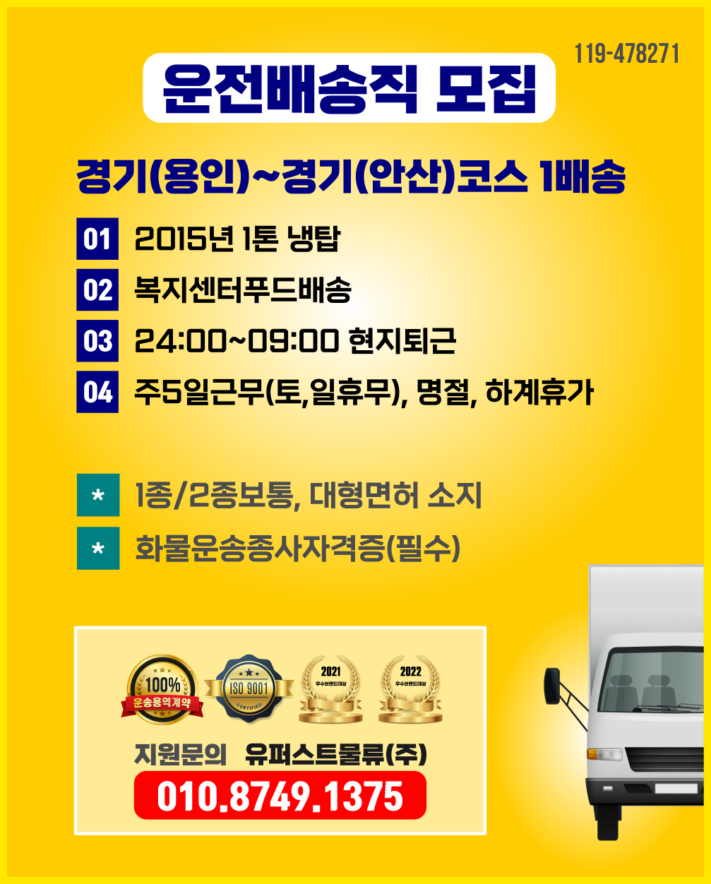 1톤정보 ★복지센터푸드배송 ( 24:00~09:00 현지퇴근/1년후 운송료 10만 인상조건 / 오토차량가능/ 증차분) 주5일근무 (당…