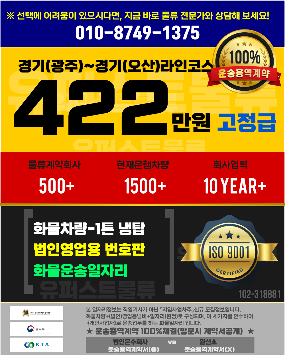 * 한번 물건 싣고 하루 30곳 내외로 고정 거래처에 배송하고 현지에서 퇴근하시면 됩니다.