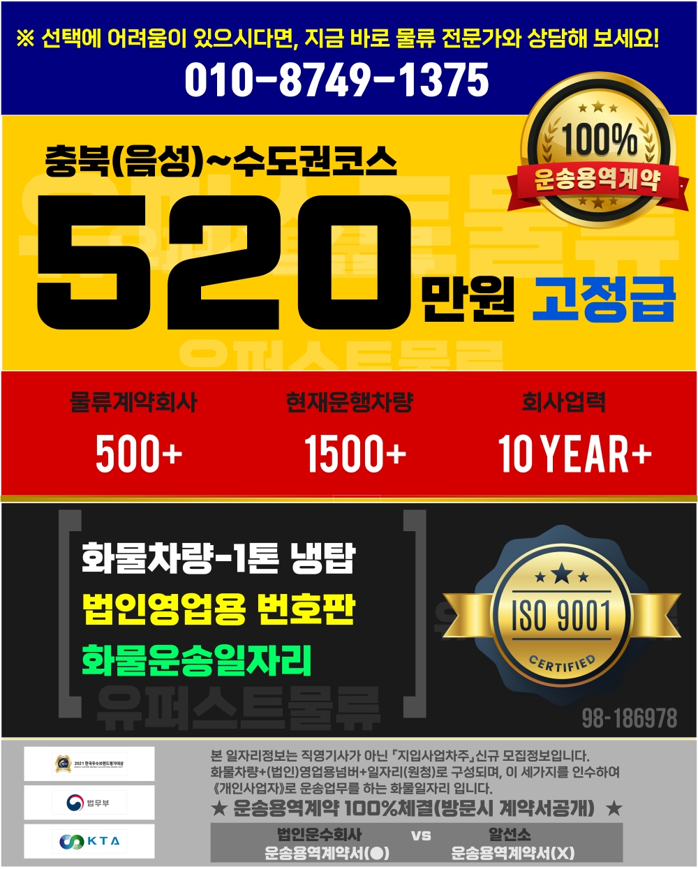 1톤정보 【충북(음성)~수도권코스 1배송 현지퇴근】520만원 (완제) +유보금최대24만,치킨프랜차이즈물품,21:00~04:00 1배송…