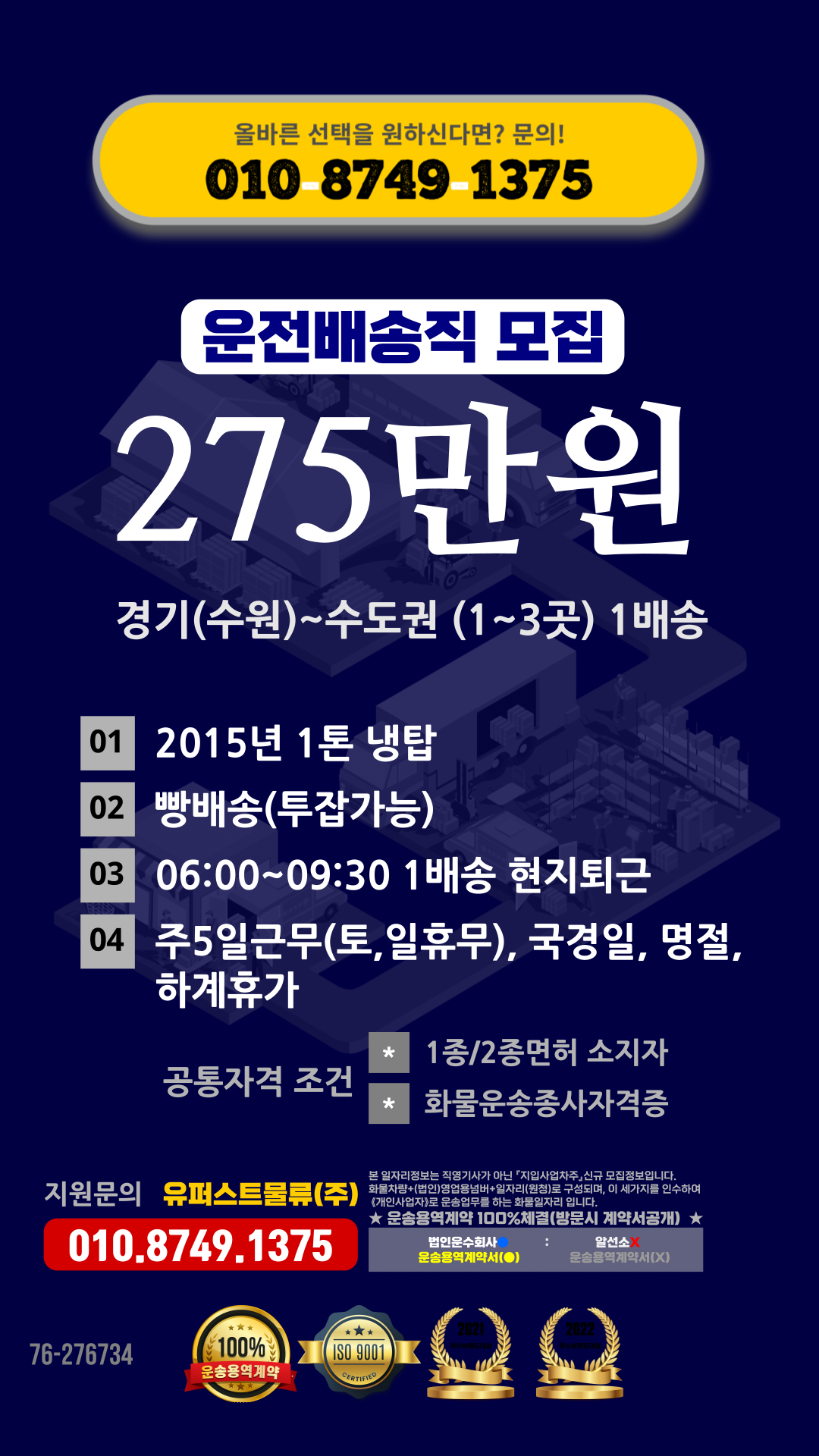 * 한번 물건 싣고 하루 1~3곳 내외로 배송하고 현지에서 퇴근하시면 됩니다.
