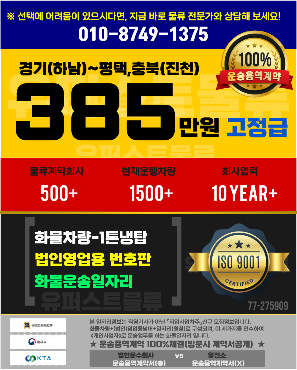 1톤정보 ★프랜차이즈물품(22:00~05:00 1배송 현지퇴근 / 근무시간 짧음 / 오토가능 / 증차분 ) 주3일근무 (당사차량)
