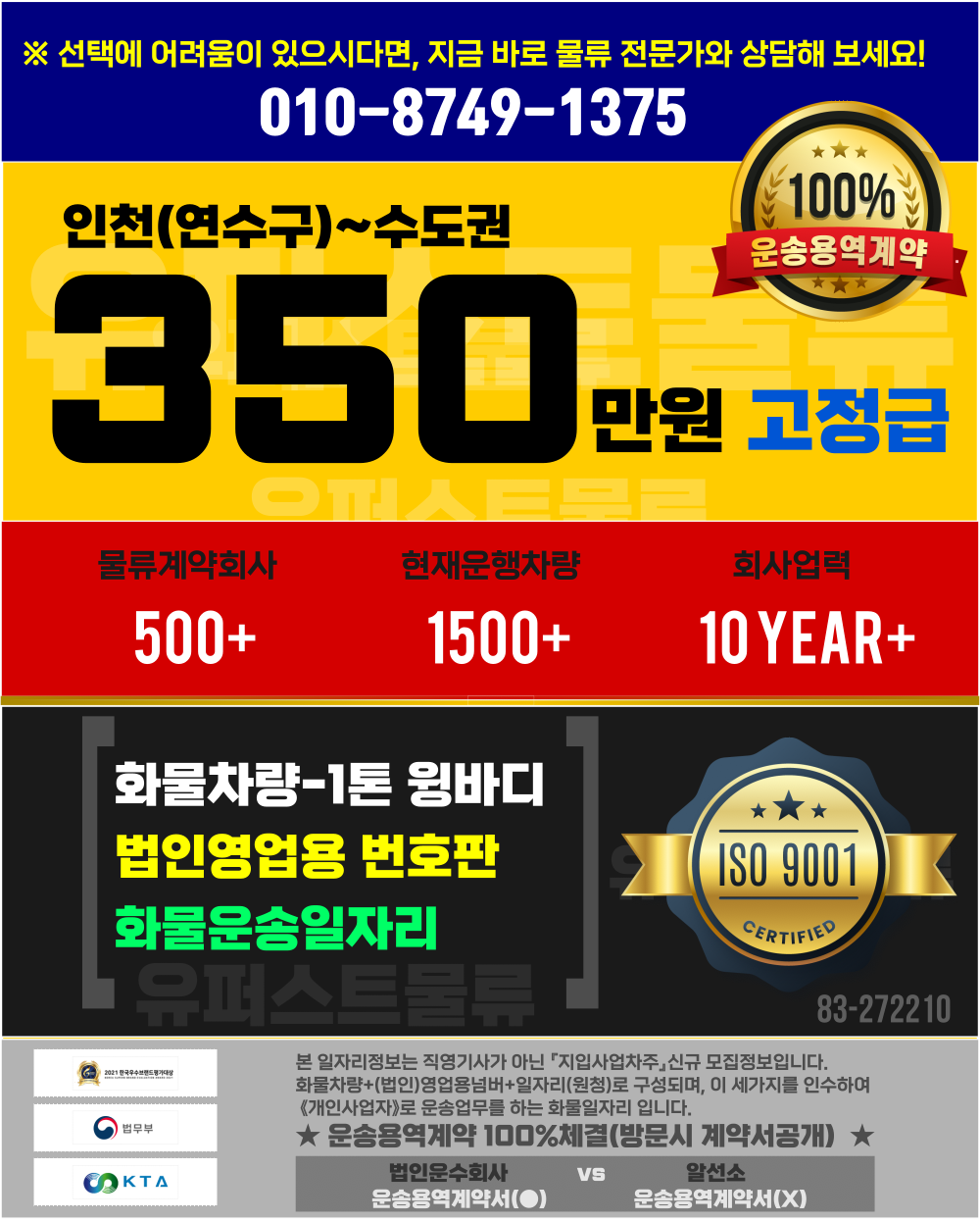 * 1주일 한번 지방 갈때 숙박비(7만원지급) 지원 하며 올라올때 현재 당사차주분들 짐차고 올라 옵니다.(+@월150만원정도) 짐차고 올라오는방법 당사차주분이 아주 상세히 알려드립니다.