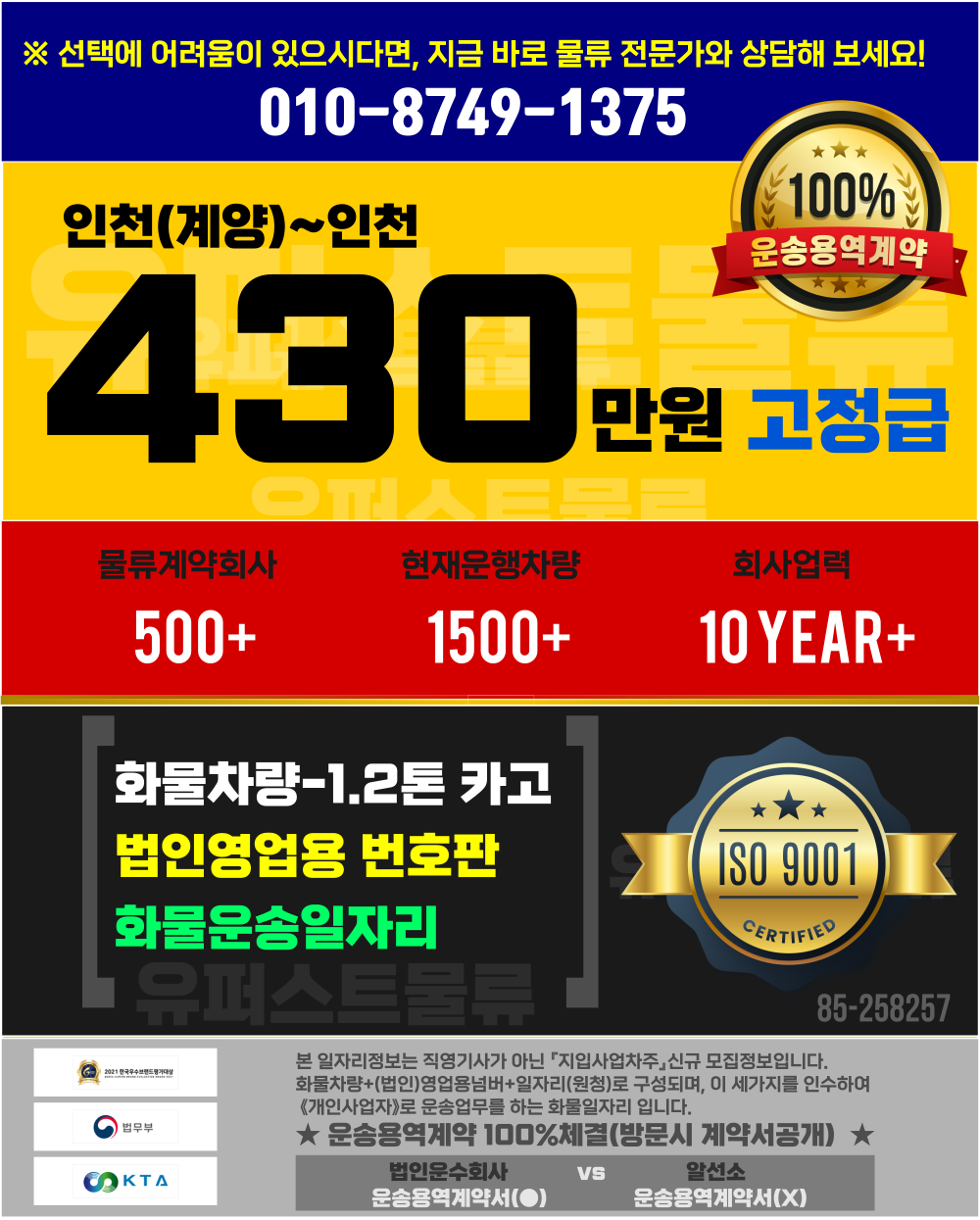 1톤정보 ★공산품유통체인 (07:00~16:00 현지퇴근 / 군데수 적음 / 증차분 ) 주5일근무 (당사차량)
